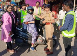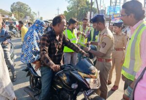 छत्रपती शिवाजी चौकातून विना हेल्मेट घालुन वाहतुक करणाऱ्यांना सार्वजनिक बांधकाम विभाग व एन एक्स टी इन्फ्राच्यावतीने मान्यवरांच्या हस्ते मोफत हेल्मेटचे वाटप करण्यात आले याशिवाय विना हेल्मेट व दारु पिवूंन वाहने चालवू नका अशा सुचना सुध्दा दिल्या.