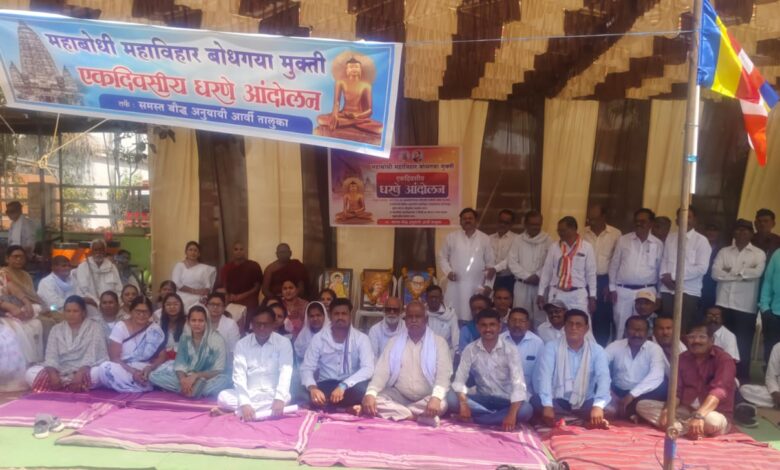 आर्वी,दि.३:-१९४९ चा महाबोधी बौद्ध विहारचा असंवैधानीक व्यवस्थापन कायदा रद्द करा. बोधगया येथील महाबोधी महाविहार महंतांच्या ताब्यातुन मुक्त करुन बौद्ध धर्मीयांच्या स्वाधीन करा. महाबोधी महाविहार परिसरात चालणारे पिंडदान विधी बंद करा आदि मागण्याकरीता येथील बौद्ध अनुयायांनी एक दिवशीय धरणे आंदोलन केले आणी उपविभागीय अधिकारी विश्वास सिरसाट यांच्या माध्यमातुन राष्ट्रपती द्रौपदी मुर्मू, प्रधानमंत्री नरेद्र मोदी व बिहारचे मुख्यमंत्री नितीश कुमार यांना निवेदन पाठवीले.