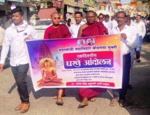 भंते संजीव व भंते आनंद यांच्या नेतृत्वात शेकडो बौद्ध् धर्मीय अनुयायी व समवीचारी लोकांच्या सहभागाने सोमवारी (ता.तिन) येथील नगरपालीका प्रशासकीय इमारती समोर हे धरणे आंदोलन झाले.