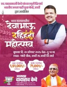 गत अनेक वर्षा पासुनची परंपरा खंडीत न होवु देता विधान परिषद सदस्य आमदार दादाराव केचे यांनी गोकुळ अष्टमी निमीत्त आयोजीत केलेल्या “देवाभाऊ दहीहंडी” स्पर्धेकरीता १ लाख ५१ हजार एक रुपयाचे प्रथम तर, ७१ हजार एकशेएक रुपयाचे दुसरे बक्षीस घोषीत केले आहे. या शिवाय सहभागी पथकांना प्रोत्साहन पर बक्षीस व शिल्ड सुध्दा दिल्या जाणार आहे.