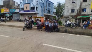 दिड मिटरच्या व्दिभाजकामुळे सुरक्षीत उभे असलेले विध्यार्थी व वाहन
